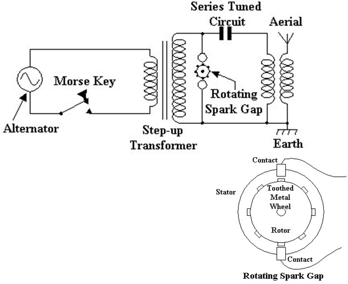 早期火花隙发射机发射波为减幅波或者叫阻尼波(不是连续波CW),在AM模式下听起来是滋滋声或者嗡嗡声。在发射时有火花,火花声音即为发射调制声音。