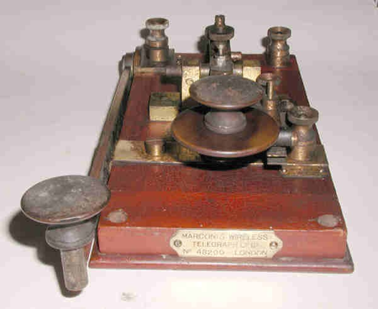 马可尼磁电键继电器(1910)译者注:低功率火花机允许直接使用电键控制电路的开闭。对于高功率设备,电流和电压都极大,需要电键控制继电器来间接控制电路。