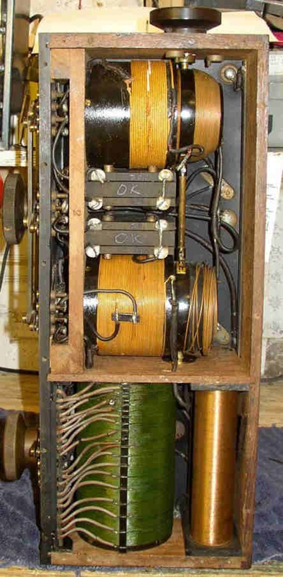 马可尼发明了无线电调谐器,1900年获得专利(编号7777)。图为马可尼多路调谐器(Marconi Multiple Tuner):调谐范围为2600-100米(120 kHz-3 MHz)。1907年由马可尼申请专利,1907-1918年被广泛使用。通常与“Maggie”磁检波器一起使用。