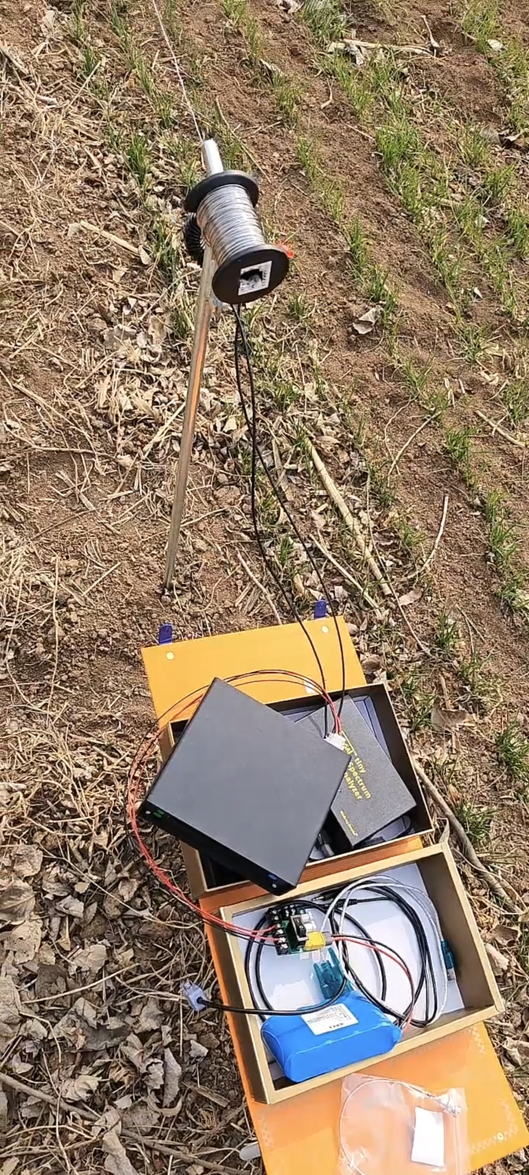这次的实验没有太多的测量,仅仅是用于实验地天线的可行性。如下图,两端距离几十米的1.2米接地镀锌钢针使用0.8mm的不锈钢线连接,通过变压器来调节阻抗。